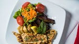 Grilled chicken cutlet with arugula, tomatoes, & Pasty's dressing.
