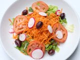 Green salad, tomatoes, carrots, olives, fine herbs, red wine vinegar, olive oil.