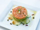 On the bed of cucumber, avocado, capers, onions topped with Citrus soy sauce.