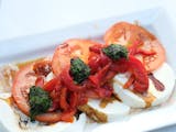 Mozzarella, vine ripened tomatoes, roasted peppers, basil pesto, EVOO.