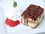 Layers of espresso drenched ladyfingers separated by mascarpone cream and dusted with cocoa powder.